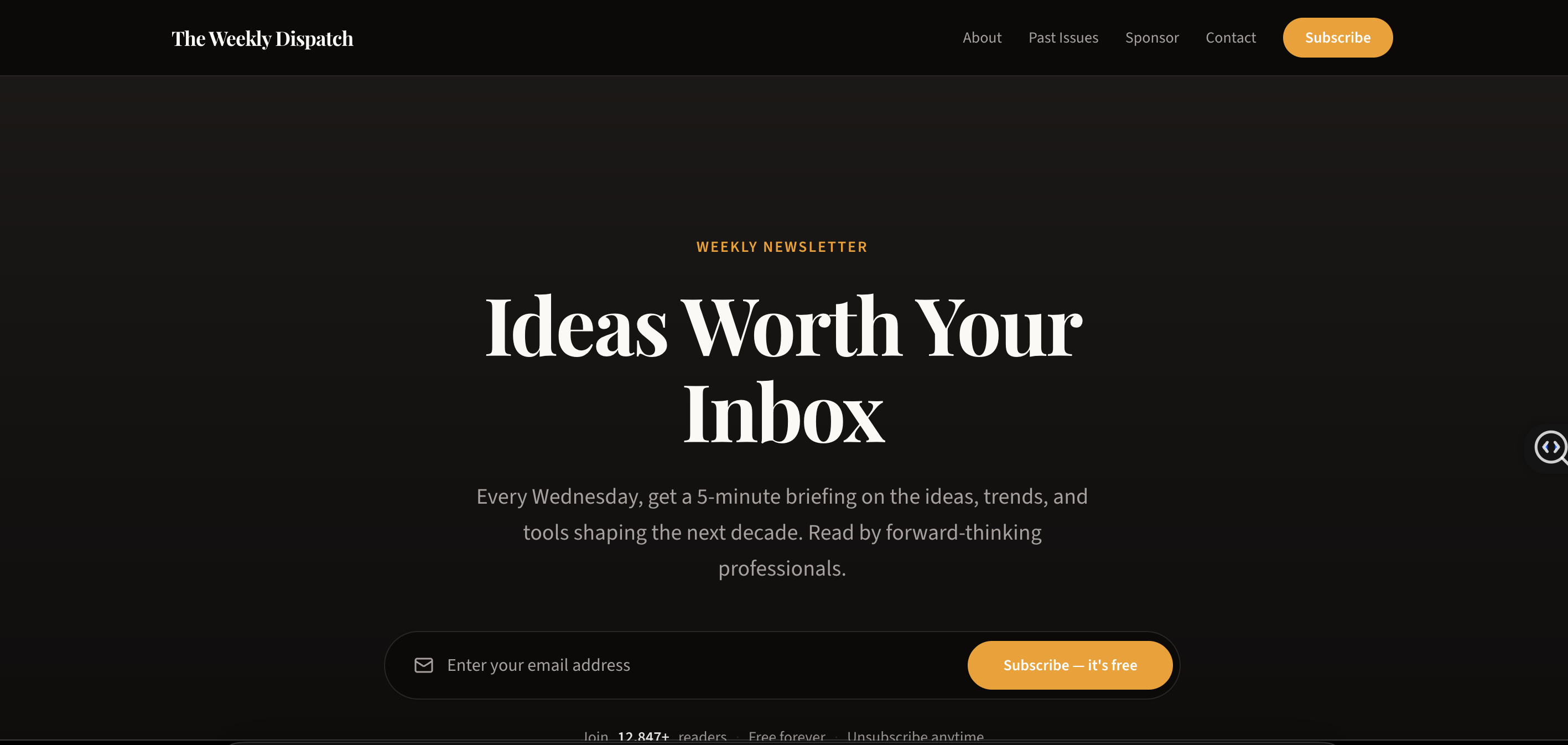 CreatorA conversion-focused newsletter landing page built to grow your audience. Features a bold hero with email capture, animated subscriber counter, searchable issue archive, reader testimonials, and a sponsor section — all designed to turn casual visitors into loyal subscribers. Comes with dark mode, smooth scroll animations, and a warm editorial design using Playfair Display and Source Sans 3. Fully customizable — swap in your newsletter name, colors, and content without touching a line of code.